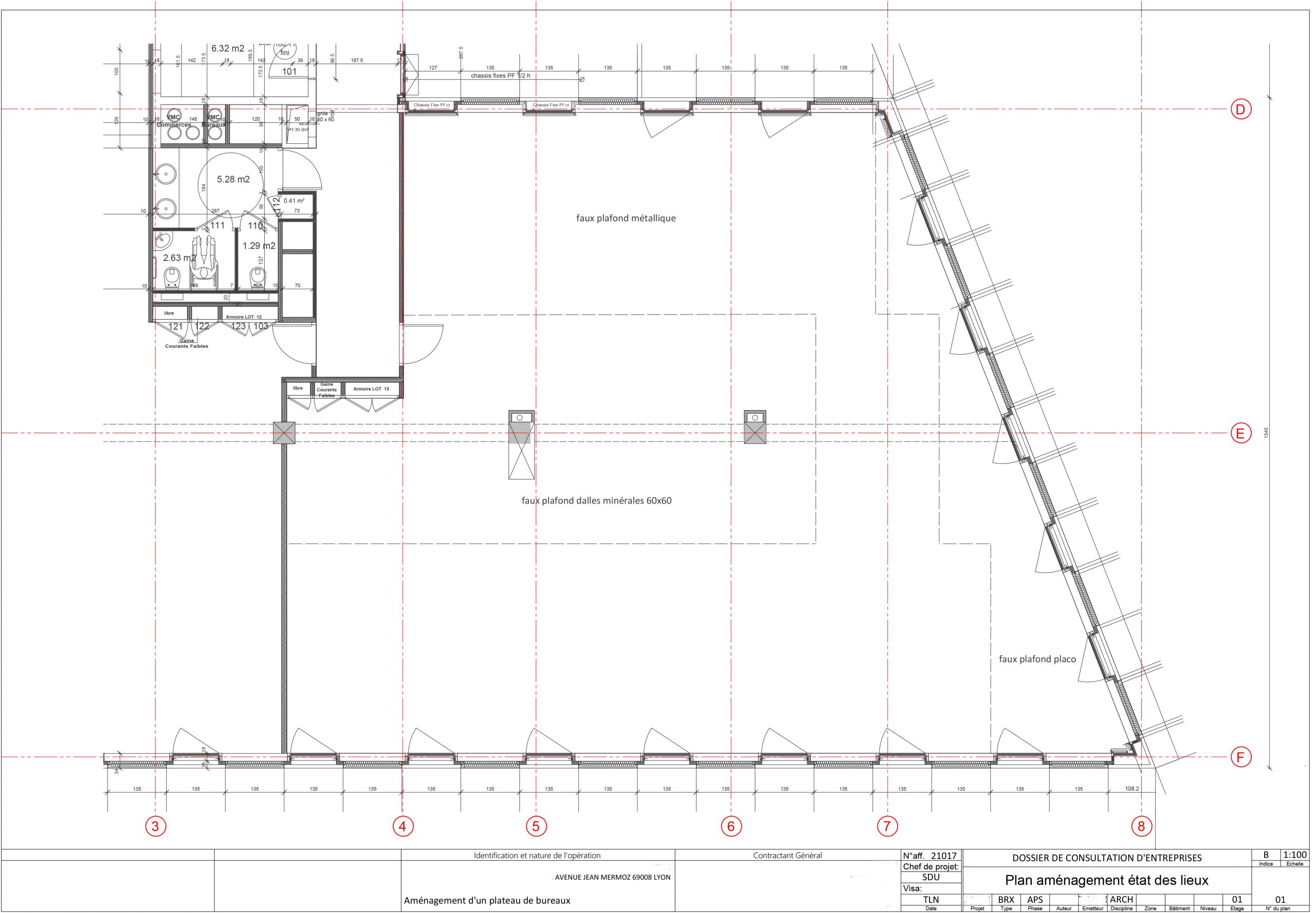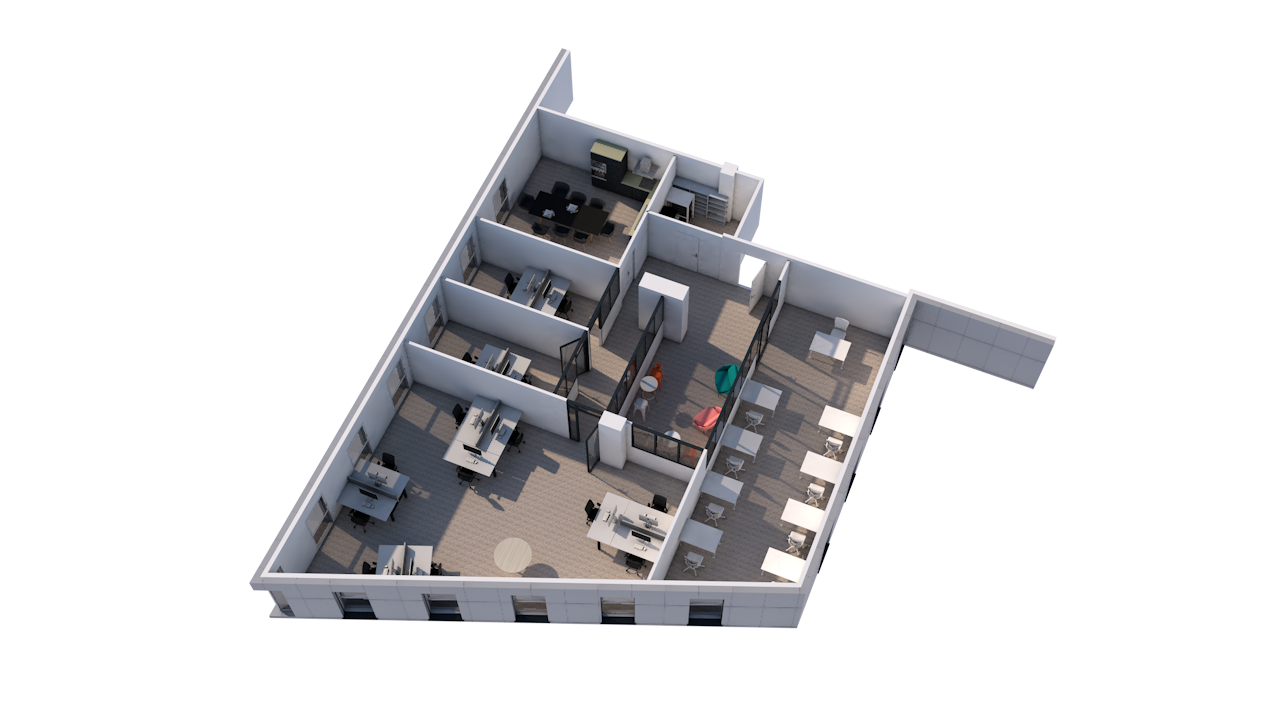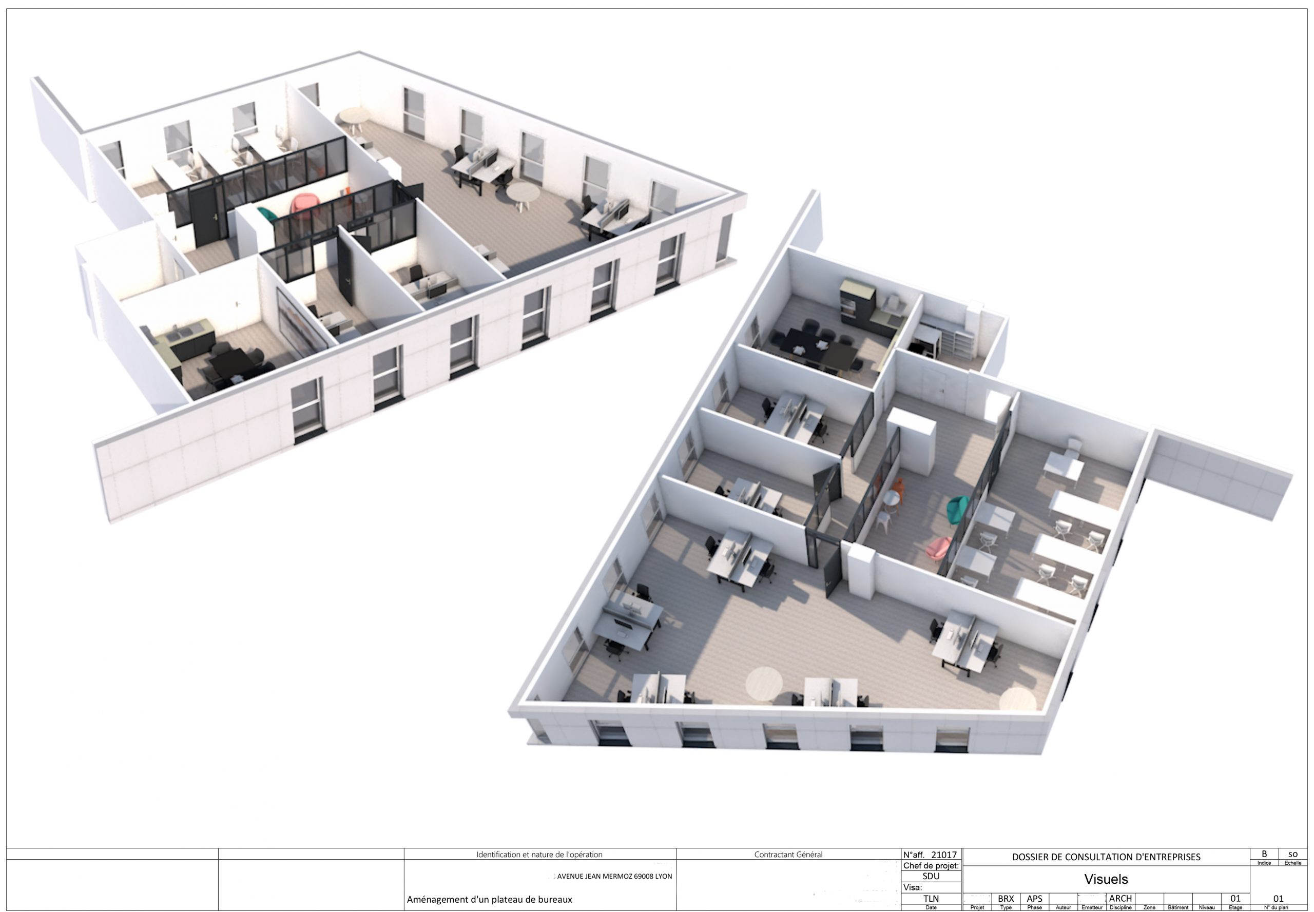 Agencement d’un plateau pour des bureaux d’entreprise. Open space, salle de travail, formation, accueil, salle de pause,…