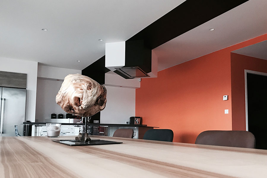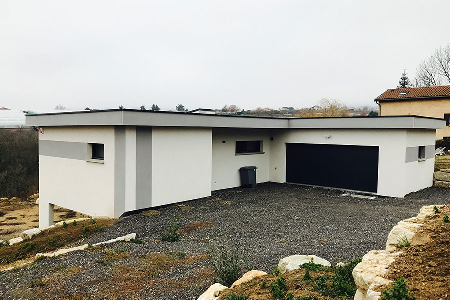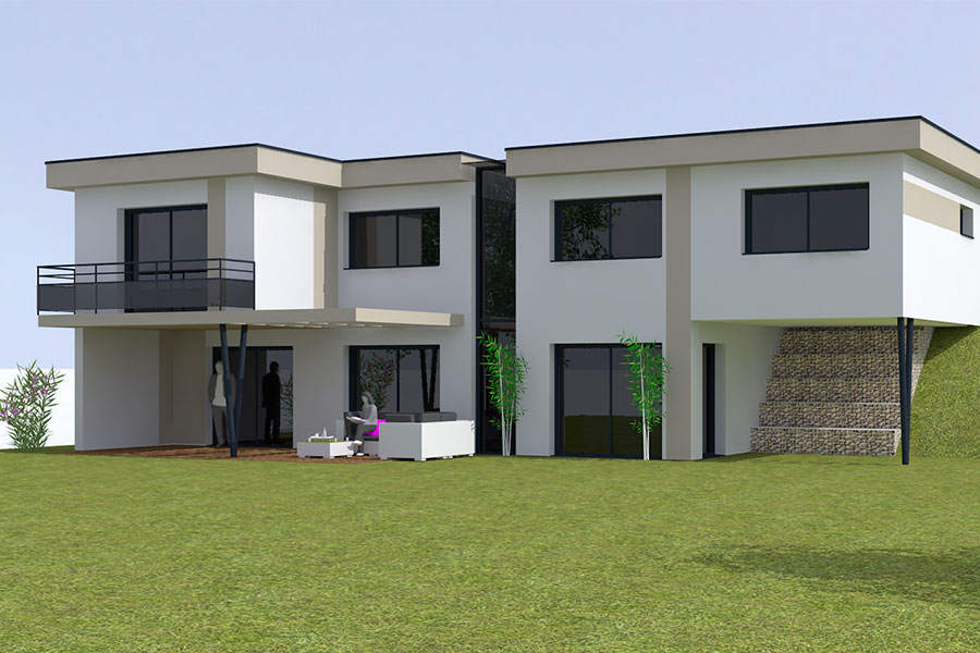 Conception d’une maison contemporaine dans site en pente, remodeling du terrain (création enrochement) et agencement des espaces en lien avec l’extérieur, accès et zone nuit à l’étage.